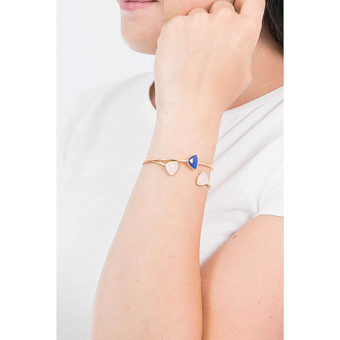 Bracciale rigido realizzato In argento 925 rosè con finitura lucida e dettaglio smaltato rosa e blu con zirconi e logo.